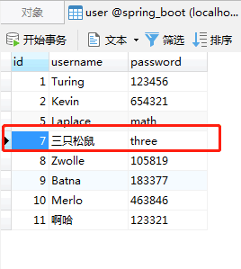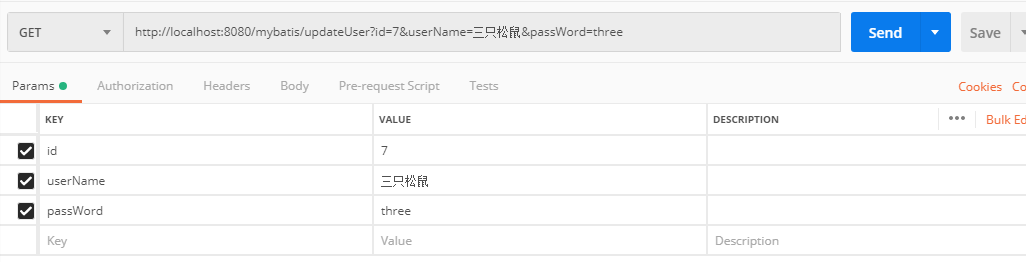 ④ http://localhost:8080/mybatis/updateuser?id=7&username=三只松鼠&password=three 设置id为7的用户的用户名和密码