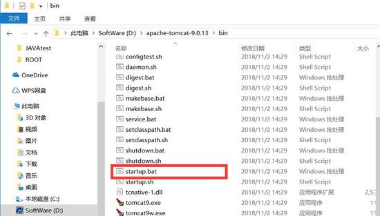 (6)现在打开存放tomcat的文件夹,找到bin文件夹下的startup.bat文件,双击打开该文件。
