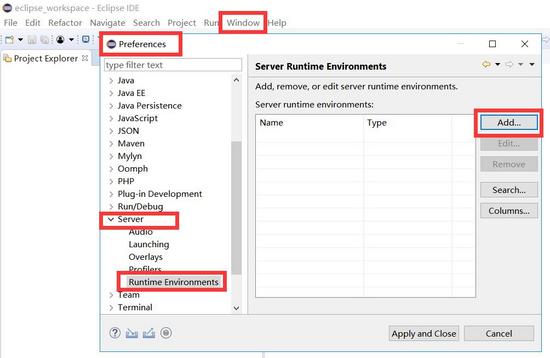 (1)打开eclipse(若未下载安装, 点击此处下载 ),在菜单栏找到并点击window,在下拉菜单中找到preference。弹出preference窗口,在窗口最左列找到server,然后点击server,在下拉菜单中选择runtime environment,再点击右上端的add…按钮。