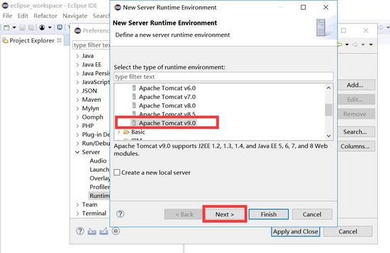 (2)在弹出的new server runtime environment 窗口中,选择我们下载并已经安装了的tomcat对应的版本,我使用的是apache tomcat v9.0,然后点击next>