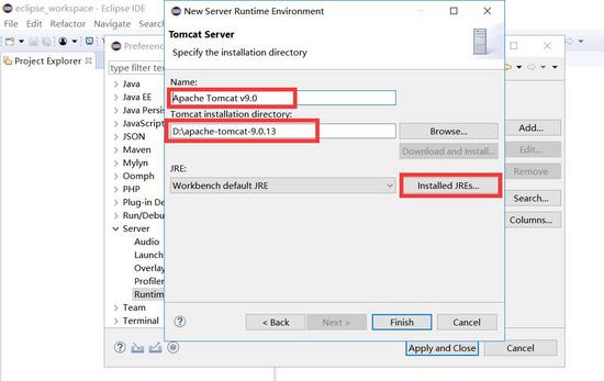 (8)依次点击apply and close按钮(应用该设置并关闭该窗口),保存并关闭我们刚才所有的设置。截止到现在,已经完成eclipse与tomcat的关联。现在进行下一步。