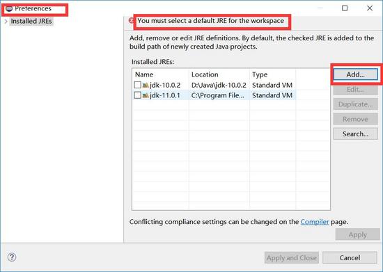 (4)点击进入后来到preferences窗口的installed jres 目录: 注意红色标记框(说明必须引入jre才行),点击add…按钮进行jre的引入。