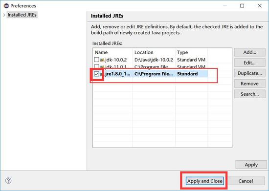 (7)点击finish按钮后,会回到preferences的installed jres 窗口,发现已经成功地引入了jre,勾选刚引入的jre: