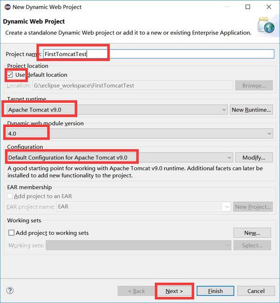 (1)打开eclipse,点击file—->new—–>dynamic web project,弹出下图窗口,根据自身情况设置好对应的参数(一般eclipse会默认填上),并依次如图操作: