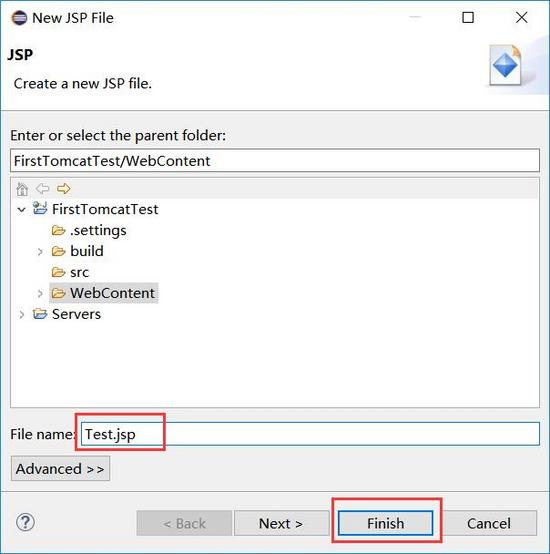在弹出的如下窗口中,设置文件名(随意自定)为:test.jsp: