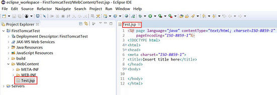 (3)点击finish后发现在webcontent目录下有一个test,jsp文件,双击该文件,右侧显示该文件中的一些默认代码: