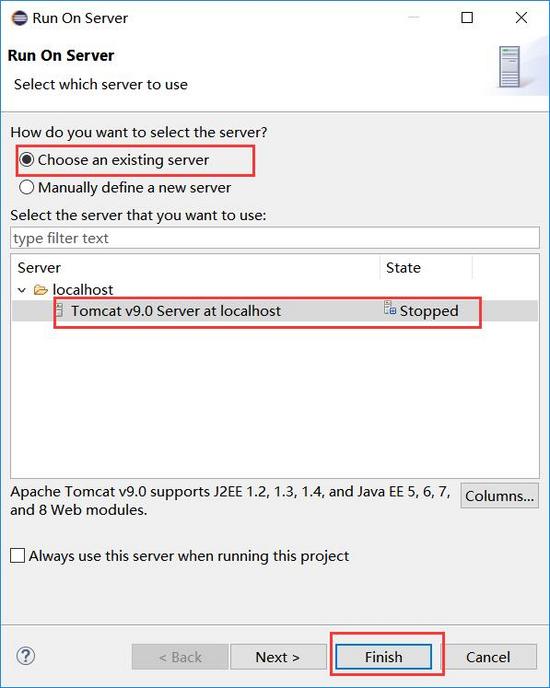 (6) 确保tomcat未在后台运行 ( 若tomcat已经在后台开启,eclipse就无法启动tomcat并使用本地web服务器,也就会出现tomcat的启动错误提示窗口,从而无法完成后续操作,所以要保证后台tomcat未运行,eclipse才可以正常运行jsp程序 ),然后选中firsttomcatproject,右击—->run as—–>run on server。将会弹出run on server的信息确认窗口: