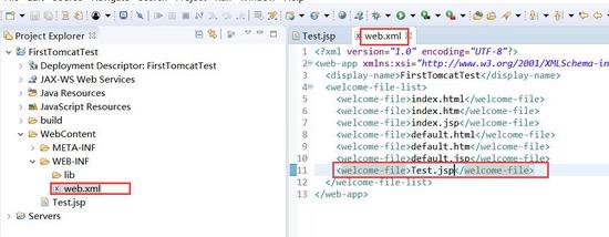 - 手动编辑工程配置文件web.xml:打开fristtomcatproject工程下的webcontent—–>web-inf——>web.xml,双击web.xml文件,在右侧对其内容进行编辑(添加一行):