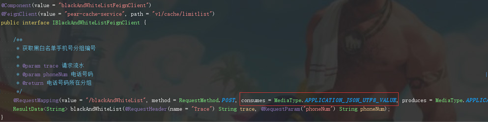 知道了问题的原因,解决起来就很简单了,我们可以在feignclient的接口定义上,指定consumes,这样,feignclient在组装http请求的时候,就会在header里面设置请求类型为application/json,这样,问题就完美解决;