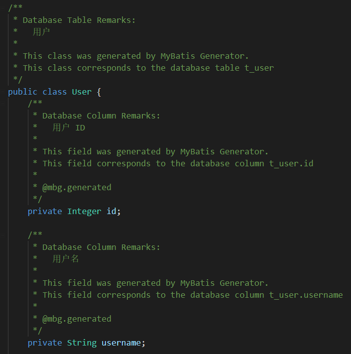 看着这个注释,让我有点纠结啊 —— 为什么不是数据库中每个字段对应的注释呢?查找相关资料,得知 mbg 生成的是由 org.mybatis.generator.api.commentgenerator 来控制的。这是一个接口,mbg 的默认实现类是做 org.mybatis.generator.internal.defaultcommentgenerator。当你在 generatorconfig.xml 中配置了 commentgenerator 标签,那么默认状态下,生成注释的工作,将由 defaultcommentgenerator来完成。 所以我们来查看下这个 defaultcommentgenerator 的源码:
