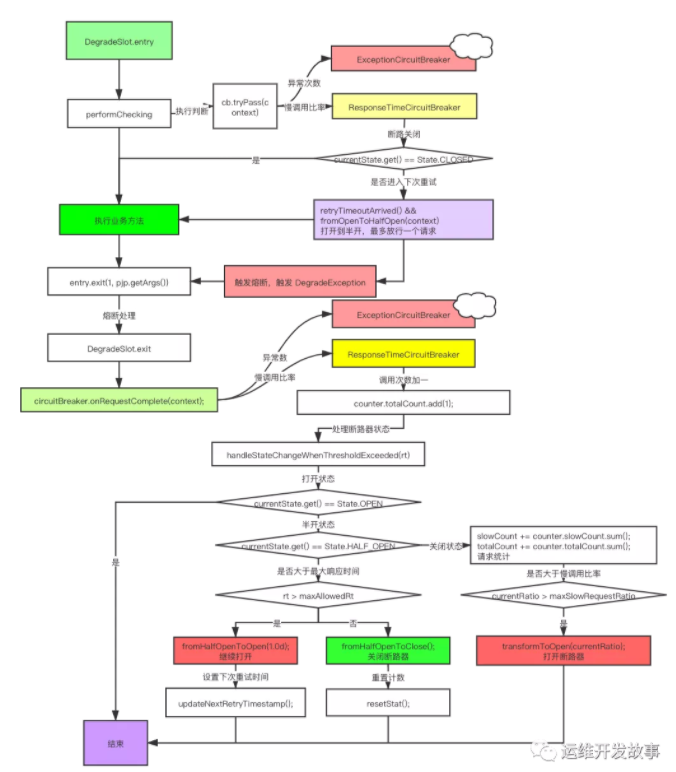 Sentinel 在 DegradeSlot 这个 Slot 中实现了熔断降级的功能,它有三个状态 OPEN 、HALF_OPEN、CLOSED 以ResponseTimeCircuitBreaker RT 响应时间维度来分析, 断路器工作的过程。下面是一个标准断路器的工作流程: