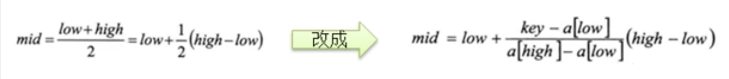 2.二分查找中求mid索引的公式转成插值查找mid索引公式,low表示左边的索引,high表示右边的索引,key表示要查找的值