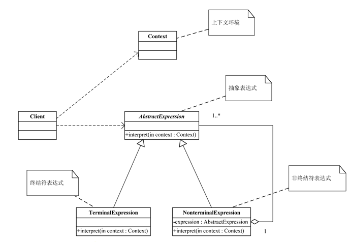 解释器模式:就是给定一个语言的文法表示,并且定义一个解释器,用来解释语言中的句子。解释器模式描述了怎样在有了一个简单的文法后,使用模式设计解释这些语句。