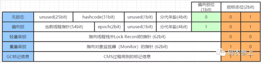 在对象头中,mark word 一共有64个bit,用于存储对象自身的运行时数据,标记对象处于以下5种状态中的某一种: