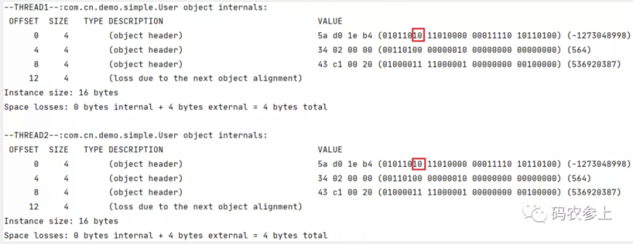 - System.out.println("–THREAD2–:"+ClassLayout.parseInstance(user).toPrintable());