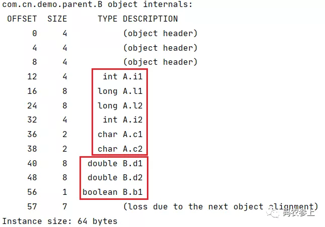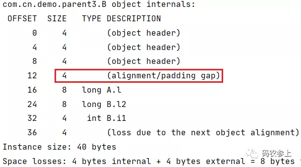 因为long类型占8字节,所以它的偏移量必定是8n,再加上前面对象头占12字节,所以long类型变量的最小偏移量是16。通过打印对象内存布局可以发现,当对象头不是8字节的整数倍时(只存在8n+4字节情况),会按从大到小的顺序,使用4、2、1字节长度的属性进行补位。为了和对齐填充进行区分,可以称其为前置补位,如果在补位后仍然不满足8字节整数倍,会进行对齐填充。在存在前置补位的情况下,字段的排序会打破上面的第一条规则。