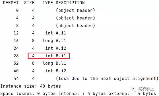 因此在上面的内存布局中,先使用4字节的int进行前置补位,再按第一条规则从大到小顺序进行排列。如果我们删除3个int类型的字段,再查看内存布局: