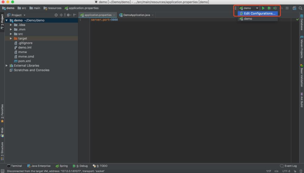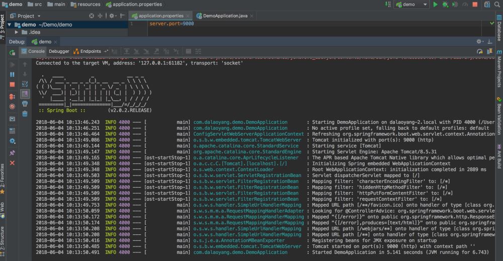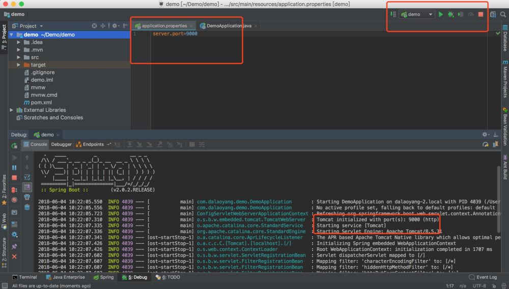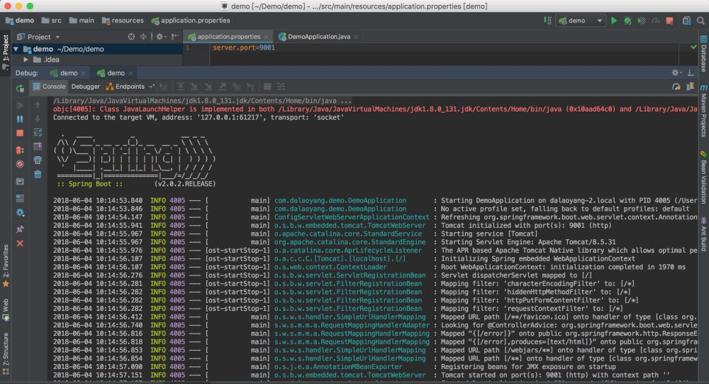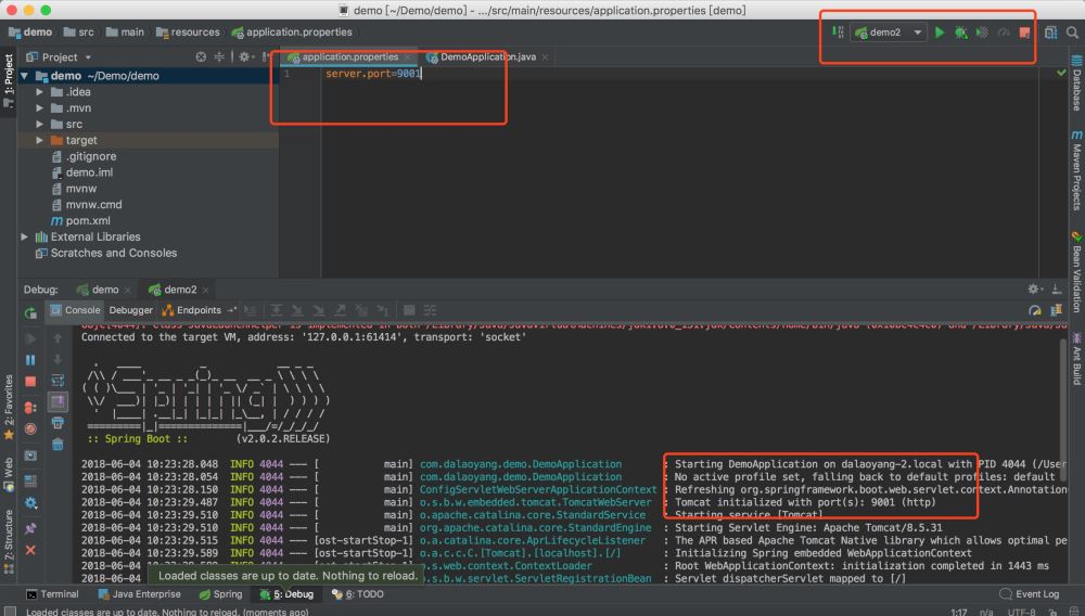 4.修改配置文件中的端口号为9001,启动项目,demo(9001),如图。