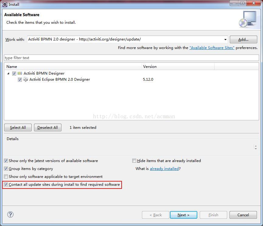 5)点击复选框在detail部分记得选中 "contact all updates sites.." , 因为它会检查所有当前安装所需要的插件并可以被eclipse下载.