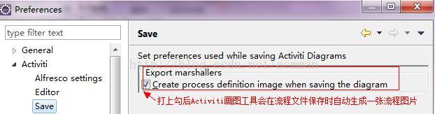 打开菜单windows->preferences->activiti->save下流程流程图片的生成方式: