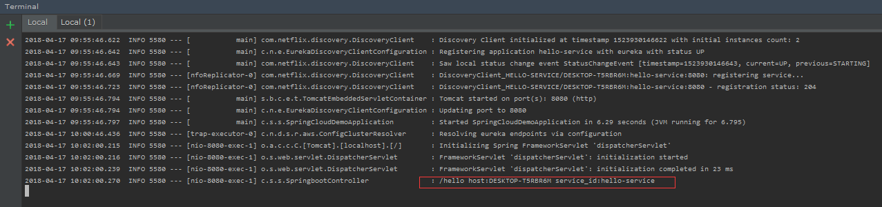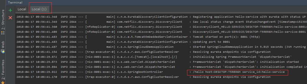 而第二个终端没有,依旧显示到resolving eureka endpoints via configuration这行