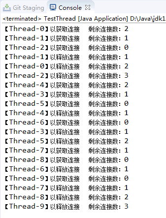 System.out.println( "【" +Thread.currentThread().getName()+ "】以获取连接 剩余连接数:" + available);