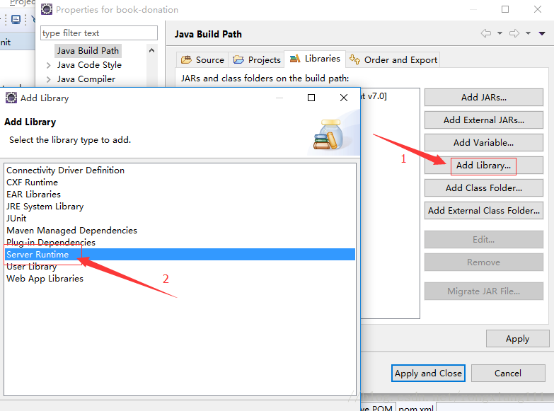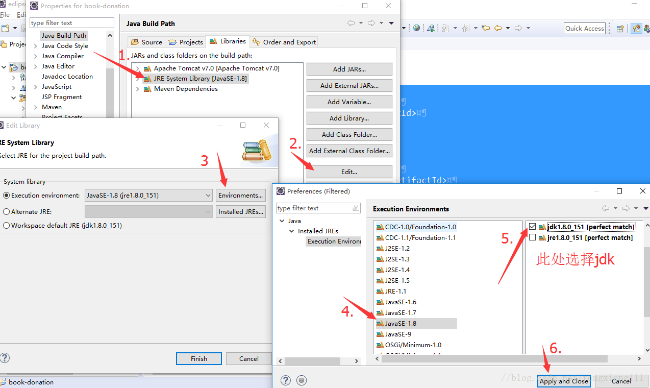 3.详细步骤:项目右键——>Build Path——>Configure Build Path…,打开窗口后,按照如下图步骤进行选择,此步骤是将jre换为jdk ,将jre换为jdk