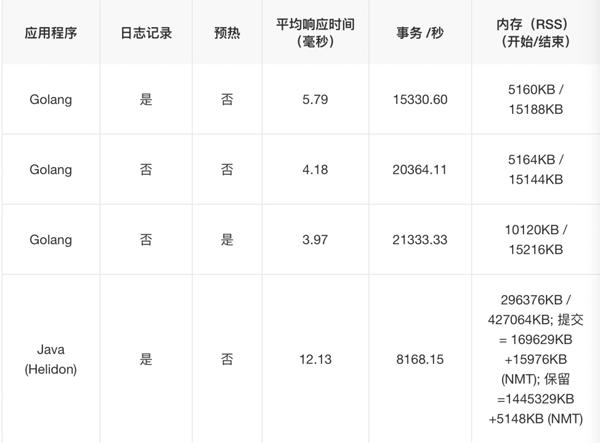 - 本轮最佳性能来自 GraalVM 原生镜像,其平均响应时间为 0.25 毫秒,每秒可执行 82426 项事务;Go 的最佳结果为 1.59 毫秒外加每秒 39227 项事务,而其内存占用量比前者高出两个数量级!