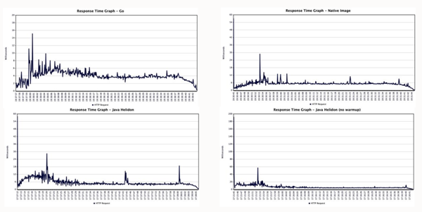 请注意,在所有三种 Java 变体当中,第一批请求的响应时间要长得多(蓝线相较于左轴的高度)而且在各项测试中,我们还看到一些峰值,其可能是由垃圾收集或优化所引起。