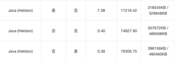 - 与 Go 相比,Java 似乎更擅长使用硬件上的多个核心与执行线程——这是因为 Go 本身主要作为系统及网络编程语言存在,而且发展周期相对较短,因此在成熟度及优化水平上不及 Java 也很正常。