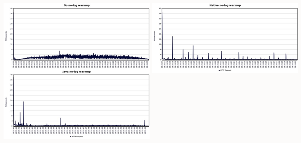 日志记录似乎是影响性能的主要问题,特别是 java.util.logging。因此,我们在启用与禁用日志记录两种条件下进行了测试。我们还注意到,Go 应用程序性能主要受到日志记录的影响。