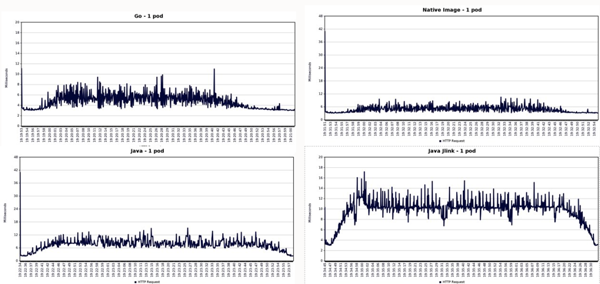 在此测试中,我们还比较了不同的执行模型——Go 应用程序被编译为原生可执行二进制文件,而 Java 应用程序被编译为字节码,而后虚拟机上运行。我们还决定引入 GraalVM 原生镜像,保证 Java 应用程序的执行环境更接近 Go 应用程序。