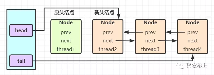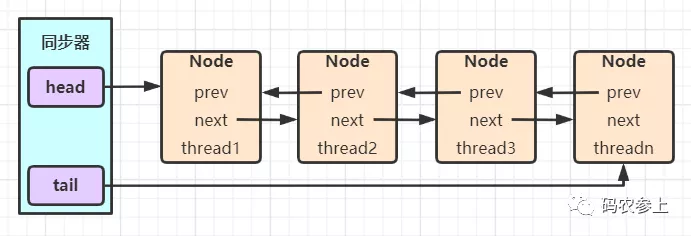 每个节点的prev和next指针在加入队列的时候进行赋值,通过这些指针就形成了一个双向列表,另外AQS还保存了同步队列的头节点head和尾节点tail,通过这样的结构,就能够通过头节点或尾节点,找到队列中的任何一个节点。使用图来表示同步队列的结构如下: