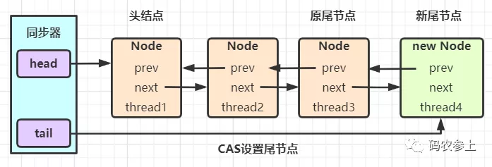 在同步队列为空的情况下,会先创建一个新的空节点作为头节点,然后通过CAS的方式将当前线程创建的Node设为尾节点。在for循环中,只有通过CAS将节点插入到队尾后才会返回,否则就会重复循环,通过这样的方式,能够将并发添加节点的操作变为串行添加,保证了线程的安全性。这一过程可以使用下图表示: