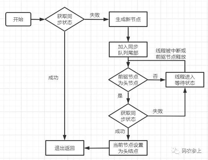 - acquire:独占式获取同步状态,如果线程获取同步状态成功那么方法返回,否则线程阻塞,进入同步队列中
