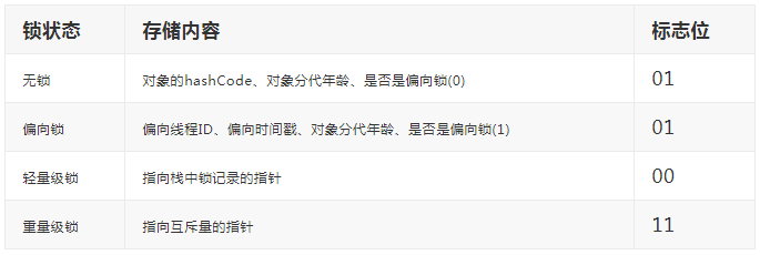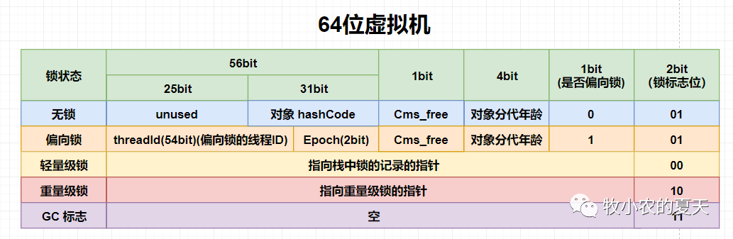 其中无锁和偏向锁的锁标志位都是01,只是在前面的1bit区分了这是无锁状态还是偏向锁状态