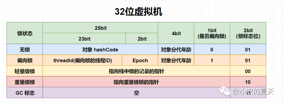 下面我们以 32位虚拟机为例,来看一下其 Mark Word 的字节具体是如何分配的