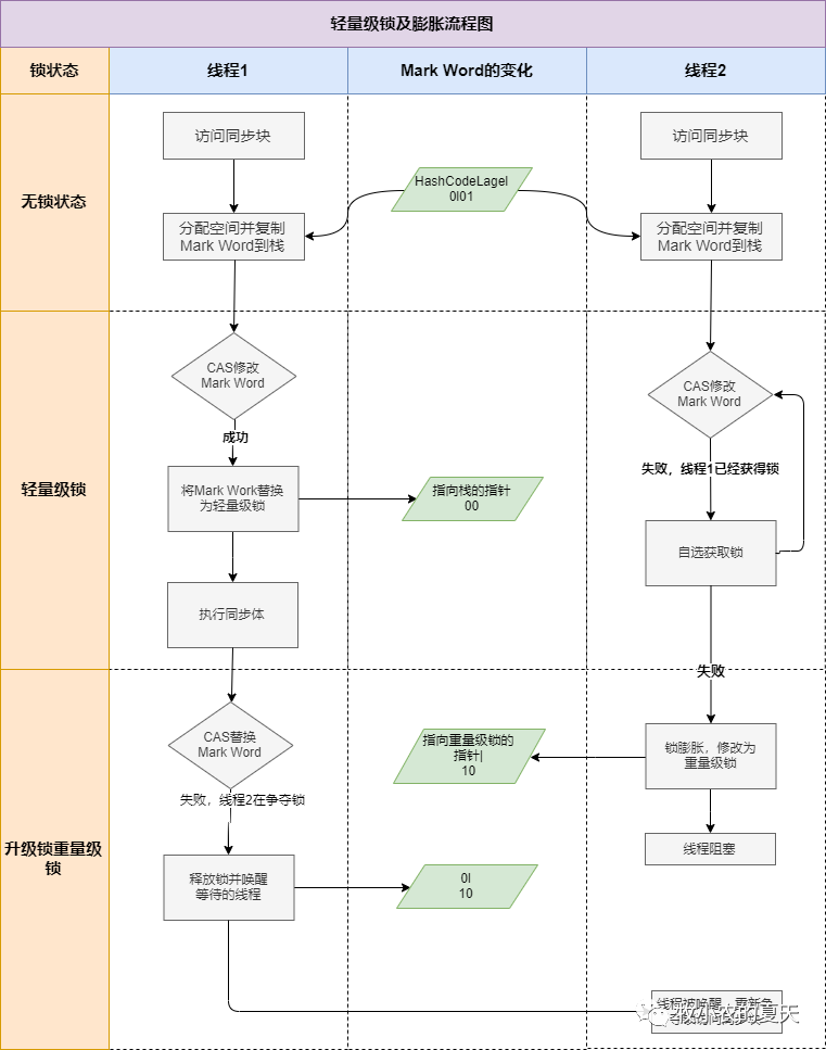 轻量级锁是指当锁是偏向锁的时候,却被另外的线程所访问,此时偏向锁就会升级为轻量级锁,其他线程会通过自旋(关于自旋的介绍见文末)的形式尝试获取锁,线程不会阻塞,从而提高性能。