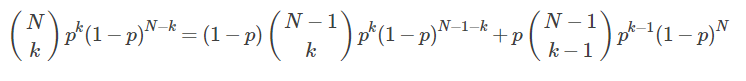 return ( 1.0 - p) * binomial(n - 1 , k, p) + p * binomial(n - 1 , k - 1 , p);