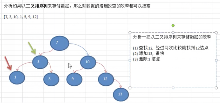 3.存储方式分析:能提高数据存储,读取的效率,比如利用二叉排序(Binary sort tree),即可以保证数据的检索速度,同时也可以保证数据的插入、删除、修改的速度。假设一组[7,3,10,1,5,9,12]以的方式存储,分析如下图: