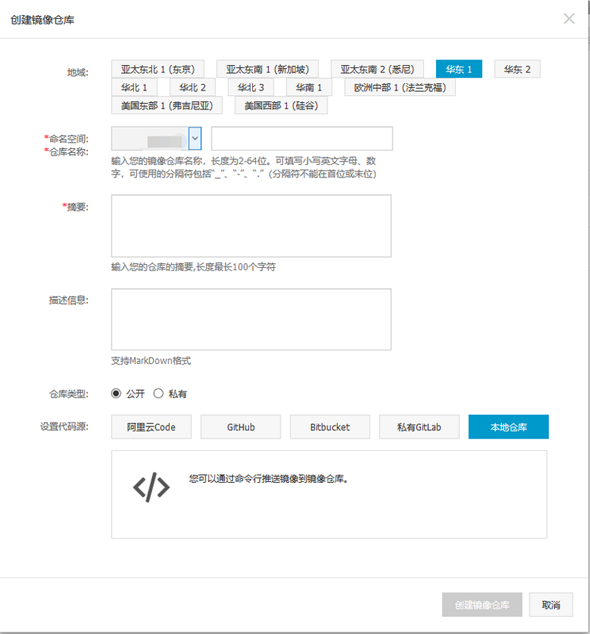 进入阿里云镜像服务链接,点击创建我的容器镜像,再点击创建镜像仓库。代码源这里选择本地仓库