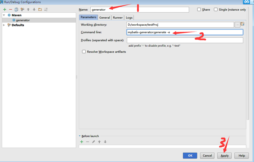 2、之后弹出运行配置框,为当前配置配置一个名称,这里其名为"generator",然后在 “command line” 选项中输入“mybatis-generator:generate -e”