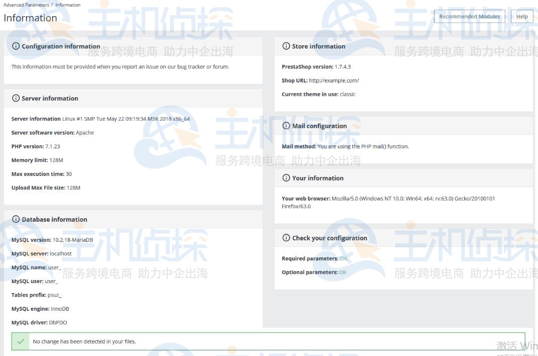 2、在信息列表页,我们可查看到与PrestaShop商店相关的配置信息,例如PHP版本、服务器软件、MySQL数据库等。
