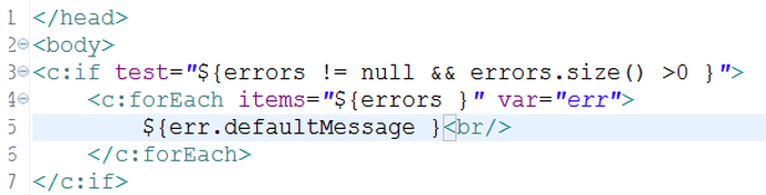 3、代码中的逻辑应该很容易看懂,就是将result中所有的错误信息取出来,然后到原先的页面将错误信息进行显示,注意,要使用model对象,则需要在形参中声明model model,然后菜能使用