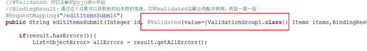 在这个方法中,那么就只会校验items这个pojo中有validationgroup1这个分组的校验注解,而不会在校验其他的