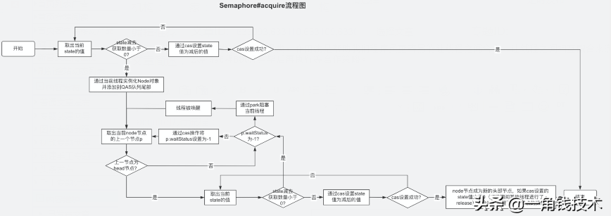 Semaphore 的内部工作流程也是基于 AQS,不同于 CyclicBarrier 和 ReentrantLock,不会使用到 AQS 的条件队列,都是在同步队列中操作,只是当前线程会被 park。