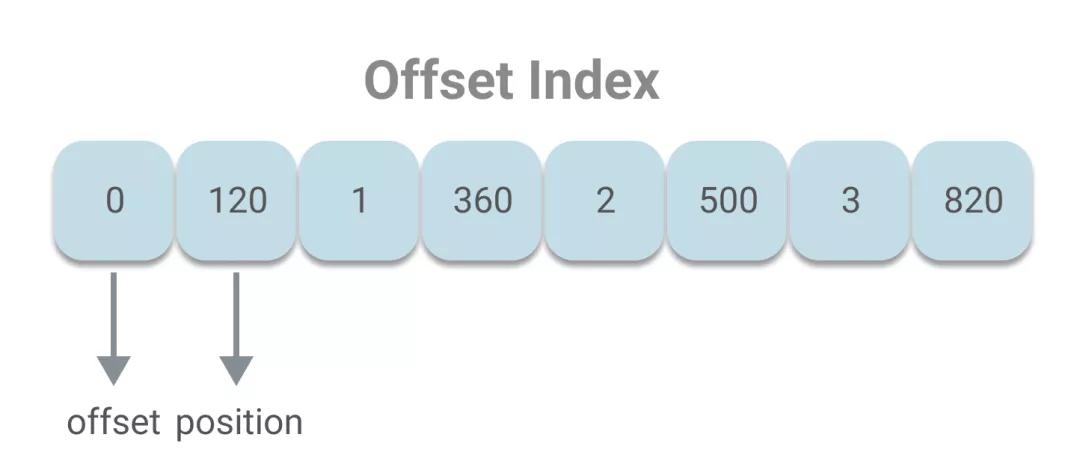 在消息日志文件中以追加的方式存储着消息,每条消息都有着唯一的偏移量。在查找消息时,会借助索引文件进行查找。如果根据偏移量来查询,则会借助位移索引文件来定位消息的位置。为了便于讨论索引查询,下文都将基于位移索引这一背景。位移索引的本质是一个字节数组,其中存储着偏移量和相应的磁盘物理位置,这里偏移量和磁盘物理位置都固定用4个字节,可以看做是每8个字节一个key-value对,如下图: