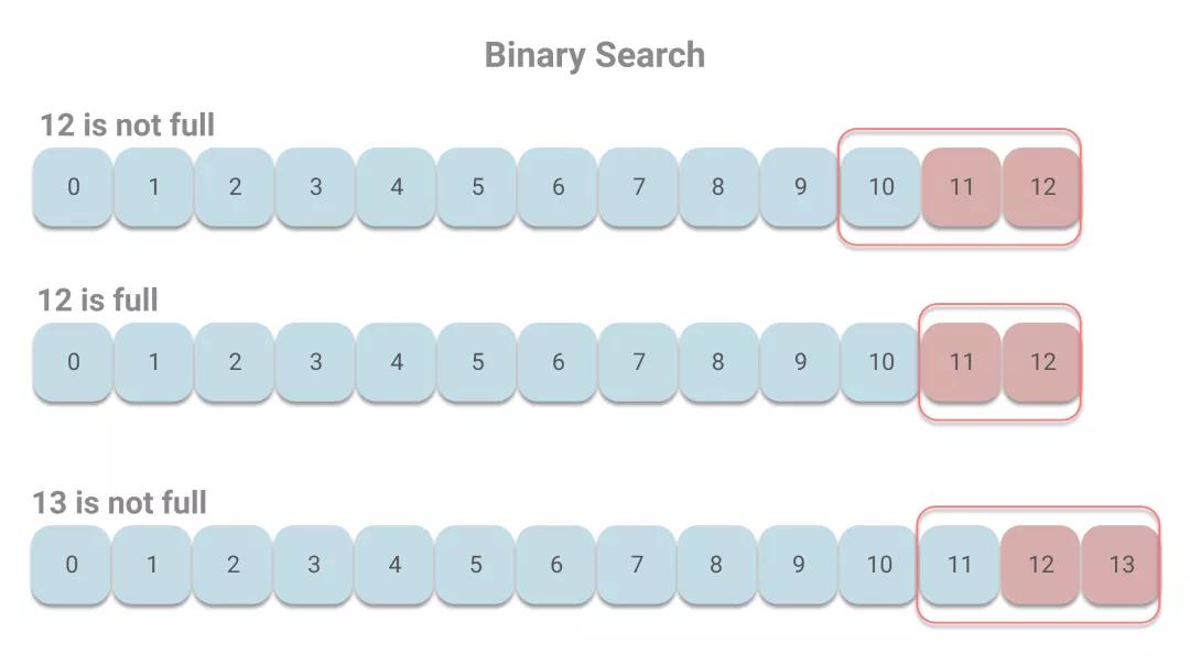 下面我们还是用之前的例子来看下。由于每个页最多包含512个索引项,而最后的1024个索引项所在页会被认为是热区。那么当12号页未满时,则10、11、12会被判定是热区;而当12号页刚好满了的时候,则11、12被判定为热区;当增至13号页且未满时,11、12、13被判定为热区。假设我们读取的是最新的消息,则在热区中进行二分查找的情况如下: