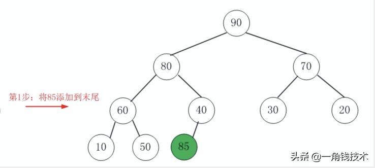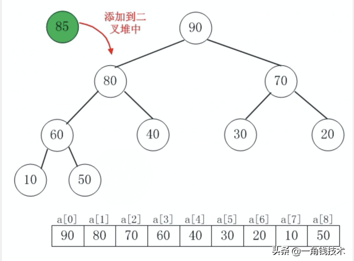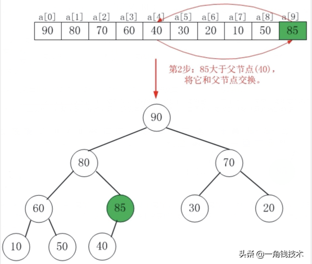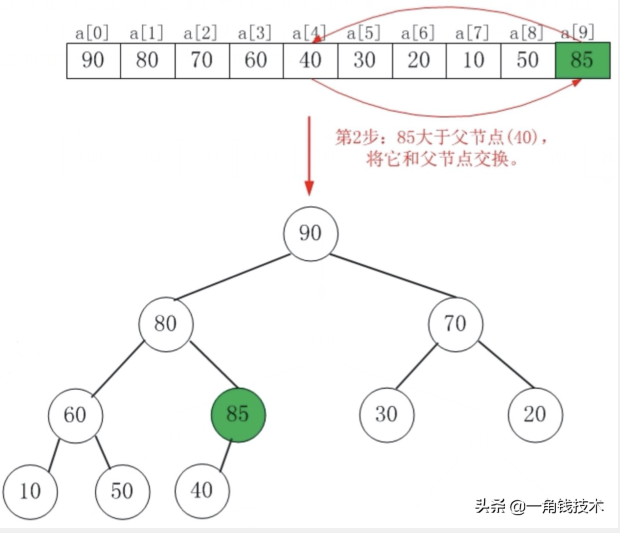 85 再继续往前走之后,它要和 80 再进行比较,同理可得:也就是说这个结点每次和它的父亲比,如果它大于它的父亲的话就交换,直到它不再大于它的父亲。