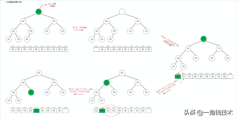 总体就是找到父节点与两个子节点中最小的一个节点,然后进行交换位置,不断重复,由上而下的交换。